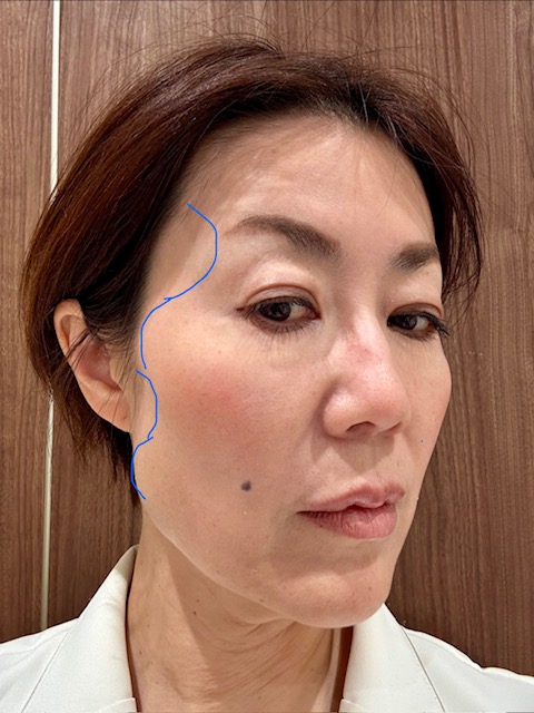 側頭部の凹み、頬骨のでっぱり、耳前の凹み、下顎角部のふくらみを組織の移動により整える結果、ひきあがるというイメージで行っています。
